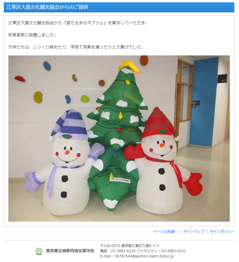 協会トピックス クリスマス 2017年12月 東京都立城東特別支援学校様にオブジェをお貸ししました 東京都立城東特別支援学校様にオブジェをお貸ししまして、 御礼の記事を書いて頂きました。 東京都立城東特別支援学校 http://www.joto-sh.metro.tokyo.jp/site/zen/page_0000000_…... 2018年1月2日