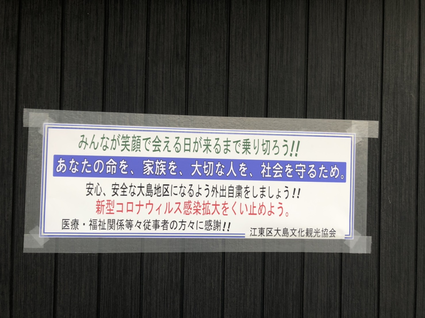 お願い 2020年5月 みんなが笑顔で会える日が来るまで乗り切ろう!! 江東区大島文化観光協会では、江東区大島の街中に、外出自粛に関する周知ポスターを 数カ所にお渡しさせて頂いています。 外出自粛宣言解除されても気を抜かずソーシャルディスタンスを取って生活をしていきましょう!! 川の…... 2020年5月25日
