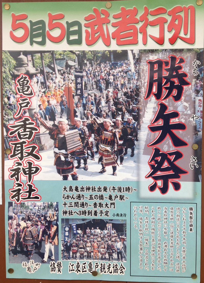 イベント 【終了】2019年5月5日 勝矢祭 武者行列 【小雨決行】 江東区大島の大島亀出神社を出発(午後1時)~ らかん通り~ 五の橋~ 亀戸駅~ 十三間通り~ 香取大門~ 香取神社へ午後3時到着予定 ... 2019年5月5日