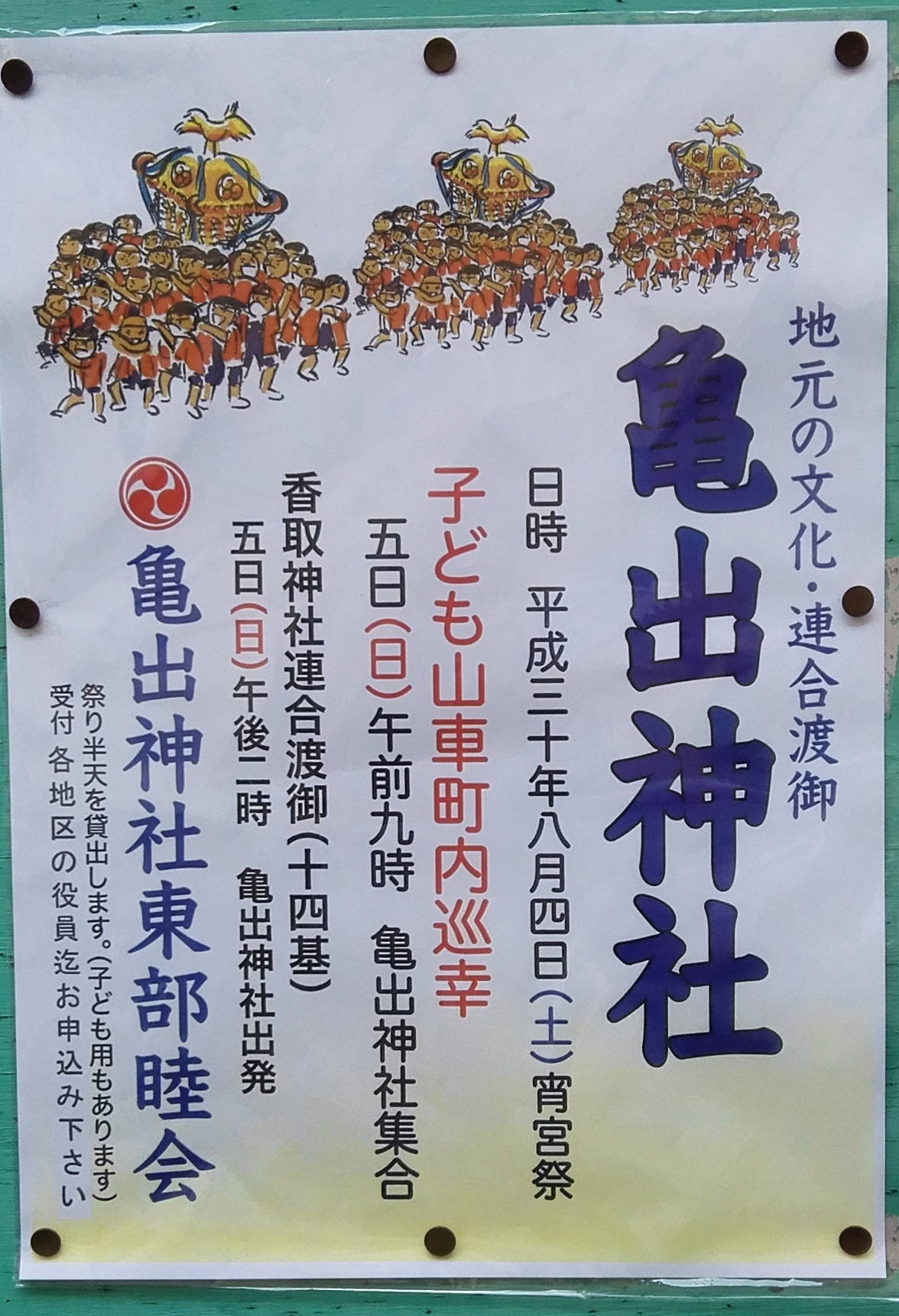 イベント 神社神輿 【終了】2018年8月4日(土)・5日(日)宵宮祭・子ども山車町内巡幸・香取神社連合渡御:亀出神社 2018年8月4日(土) 宵宮祭 2018年8月5日(日)9:00 亀出神社集合 子ども山車町内巡幸 2018年8月5日(日)14:00 亀出神社出発 香取神社連合渡御(十四基) 亀出神社東部睦会... 2018年7月20日