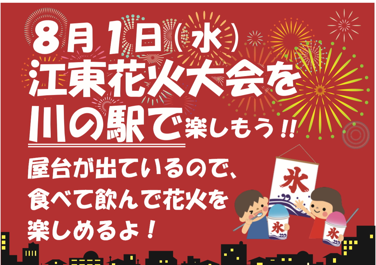 イベント 花火大会 【終了】2019年8月1日(木)江東花火大会を川の駅で見よう!! 2019年8月1日(木) 江東花火大会を川の駅で見よう!! ※小雨決行、荒天(風速7メートル以上)等の場合は中止(順延日なし) 江東区のホームページより https://www.city.koto.lg.jp/101032/k…... 2019年7月13日