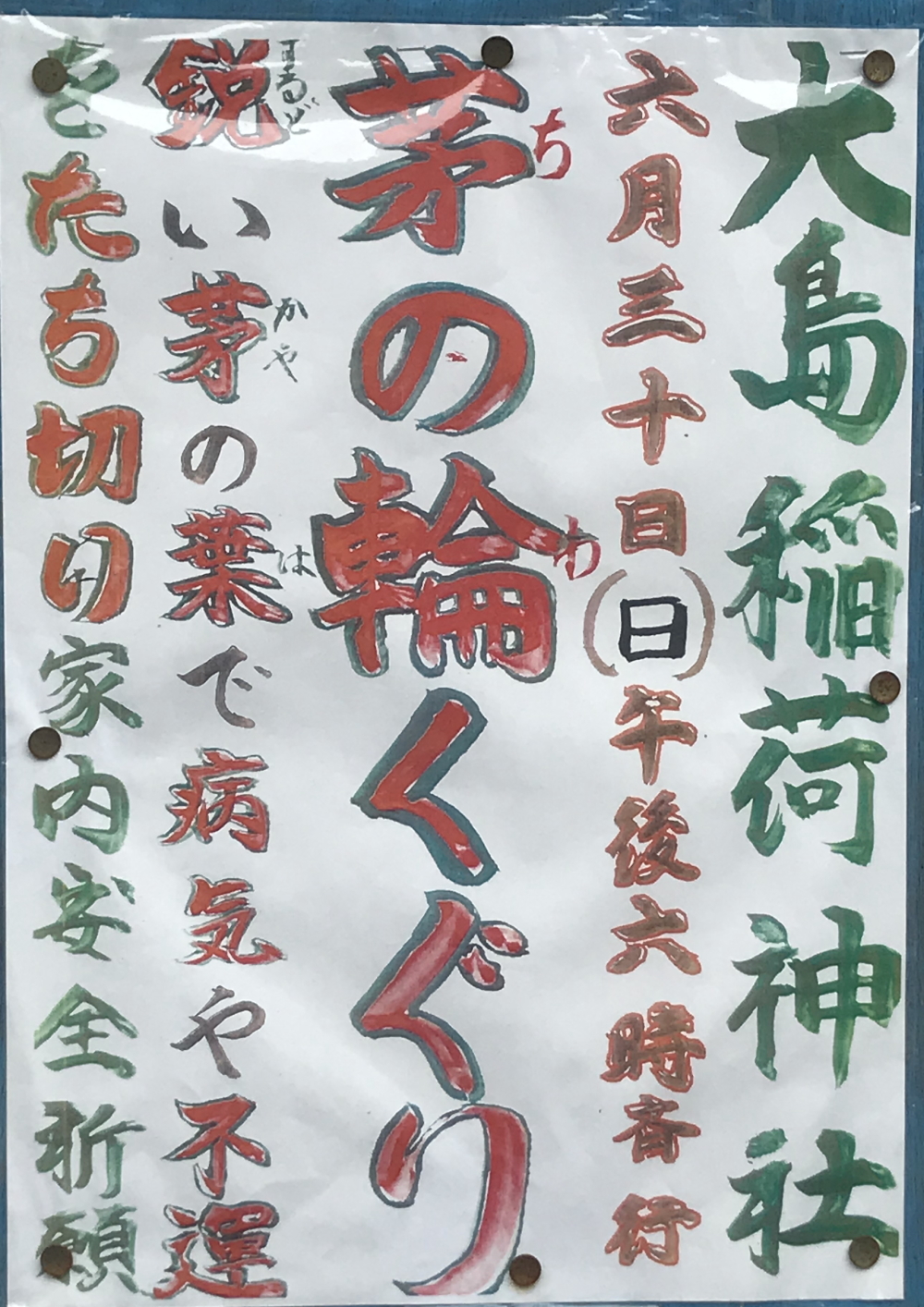 イベント 【終了】2019年6月30日(日)18:00~ 茅の輪くぐり 大島稲荷神社 茅の輪くぐり 大島稲荷神社 東京都江東区大島5丁目39−26 https://tesshow.jp/koto/shrine_oshima_inari.html... 2019年6月25日