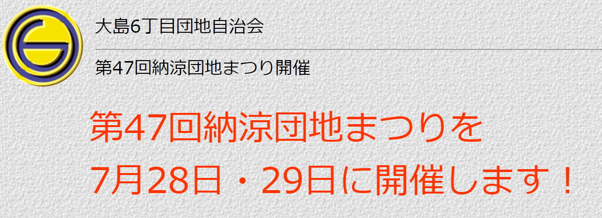 イベント 江東区大島6丁目 【終了】2018年7月28日(土)29日(日)第47回納涼団地まつり開催 大島6丁目団地自治会 2018年07月09日 2018年08月05日 Facebook Twitter 第47回納涼団地まつり開催 2018年7月28日(土)29日(日) 大島6丁目団地自治会ホームページ http://www.6-dan.com/maturi18/18maturikifu.html Facebook Twitter