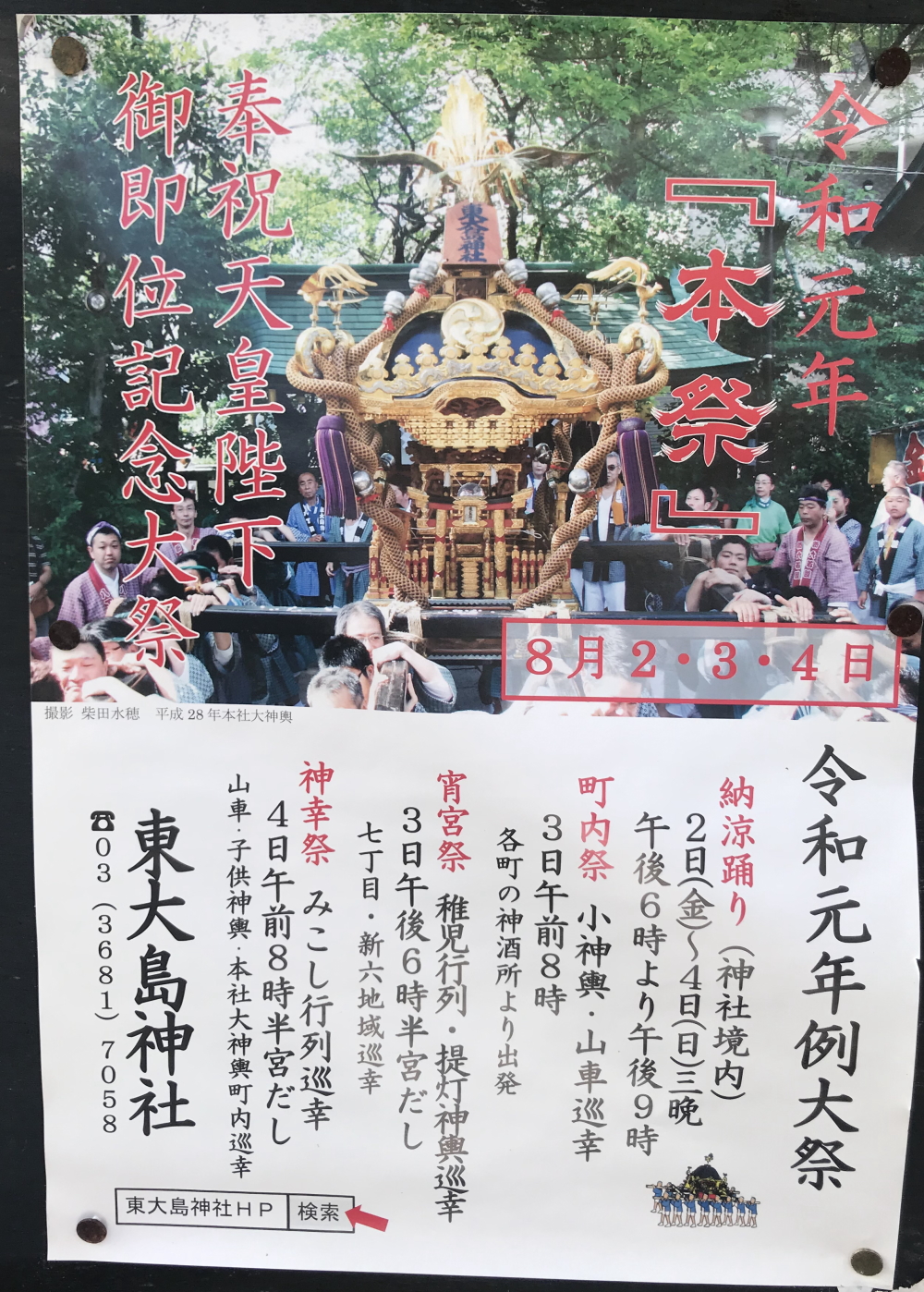 イベント 神社・寺 【終了】2019年8月2日(金)・3日(土)・4日(日)天皇陛下御即位記念大祭 例大祭 本祭り 2019年08月04日 2019年08月07日 Facebook Twitter 詳細は、ホームページでご確認ください。 東大島神社HP http://www7b.biglobe.ne.jp/~higashioojimajinja/ Facebook Twitter